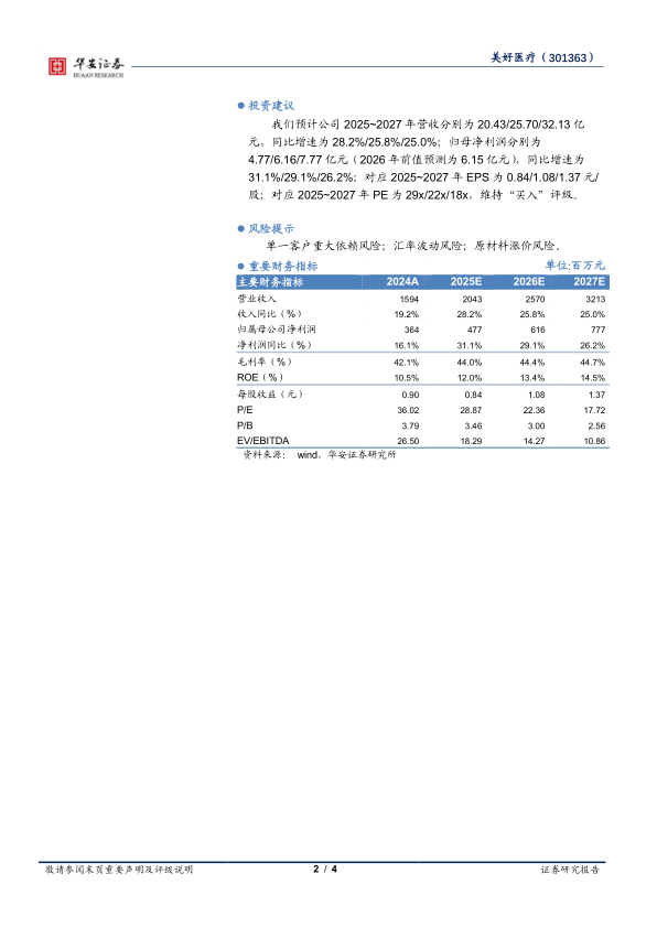 我们预计公司2025~2027年营收分别为20.43/25.70/32.13亿元,同比增速为28.2%/25.8%/25.0%;归母净利润分别为4.77/6.16/7.77亿元(2026年前值预测为6.15亿元),同比增速为31.1%/29.1%/26.2%;对应2025~2027年EPS为0.84/1.08/1.37元/股;对应2025~2027年PE为29x/22x/18x,维持“买入”评级。