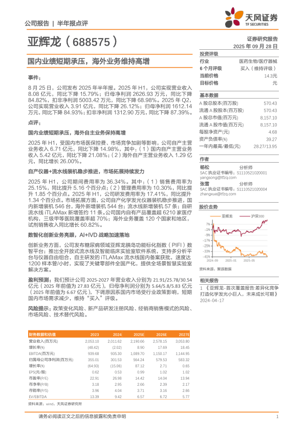亚辉龙2025年半年度报告显示,公司面临国内市场业绩承压的挑战,但海外业务保持增长,数智化创新业务取得进展。公司增加了研发投入,并在市场拓展方面取得了一定的成果。考虑到国内市场政策的影响,报告下调了公司未来几年的盈利预测,但维持了“买入”评级。投资者应关注公司在市场竞争和政策变化下的应对策略,以及海外业务和创新业务的发展潜力。