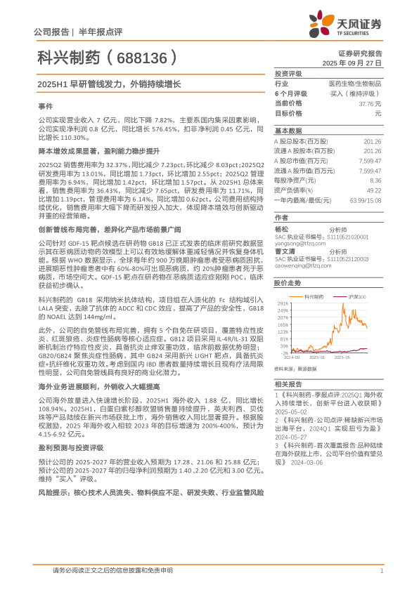 科兴制药2025年上半年业绩表现亮眼,净利润大幅增长,主要得益于降本增效措施的实施和创新管线的逐步推进。公司在GDF-15靶点和自免领域的创新药物研发具有差异化优势,市场前景广阔。同时,海外市场拓展顺利,外销收入显著提升,为公司业绩增长注入新动力。维持“买入”评级,但需关注核心技术人员流失、物料供应不足、研发失败和行业监管风险。