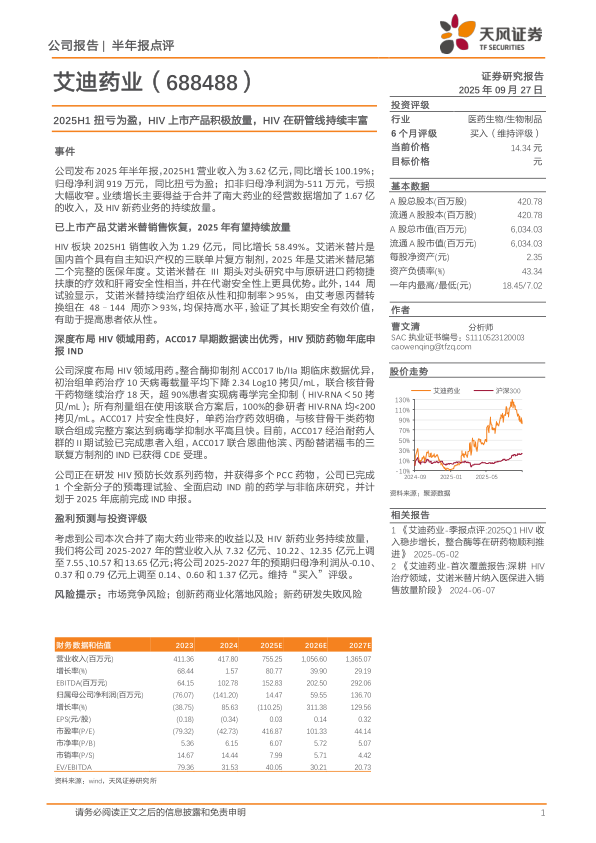 艾迪药业2025年上半年业绩表现亮眼,扭亏为盈,主要得益于并购和HIV药物的销售增长。艾诺米替片市场潜力巨大,在研药物ACC017临床数据优秀,HIV预防药物研发也在积极推进中。天风证券上调了公司未来几年的盈利预测,维持“买入”评级,表明对公司未来发展前景的看好。投资者应关注市场竞争风险、创新药商业化落地风险以及新药研发失败风险。