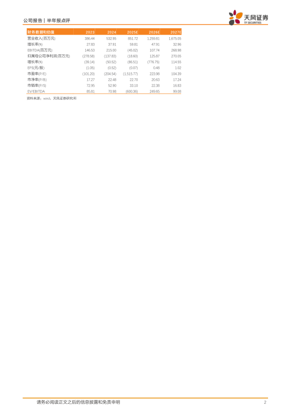 我们预计公司2025至2027年营业收入为8.52亿、12.60亿、16.75亿元人民币,实现归母净利润-0.19亿、1.26亿、2.70亿元人民币,维持“买入”评级。