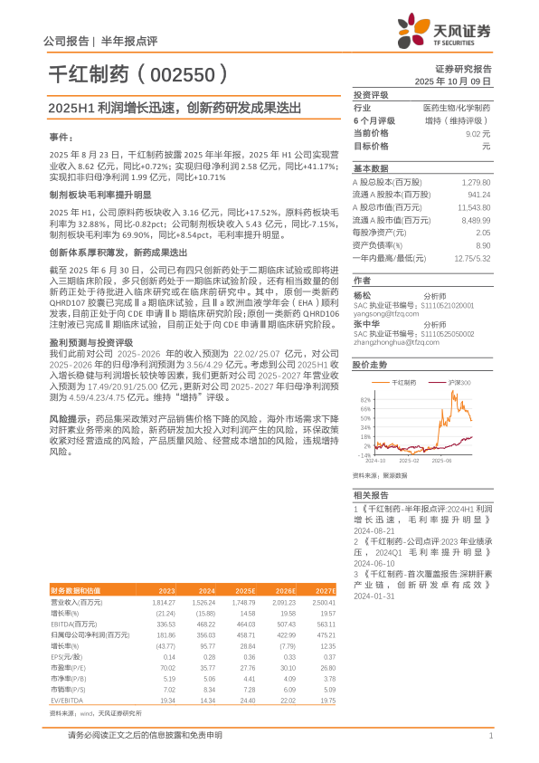 千红制药2025年上半年业绩表现亮眼,归母净利润大幅增长,主要得益于制剂板块毛利率的显著提升。公司创新药研发进入关键阶段,多个项目进入临床后期,有望成为未来业绩增长的新动力。维持“增持”评级,但需关注药品集采、海外市场波动、研发投入、环保政策以及其他经营风险。