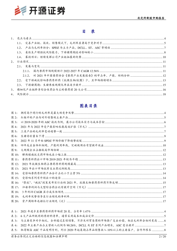 公司所处行业:兽药—兽用化学药品—兽用化学原料药。据Grand View Research,2022年全球兽药市场规模约445.90亿美元,到2030年均复合增长率为8.2%。根据中研网发布的《2022-2027年兽药产业深度调研及未来发展趋势预测报告》,2021年全国兽药行业销售额686.18亿元,预计到2027年复合增长率为12.56%。受下游减抗政策,即兽用抗菌药使用减量化,以及猪周期波动的影响较小,且能进行出口转化。