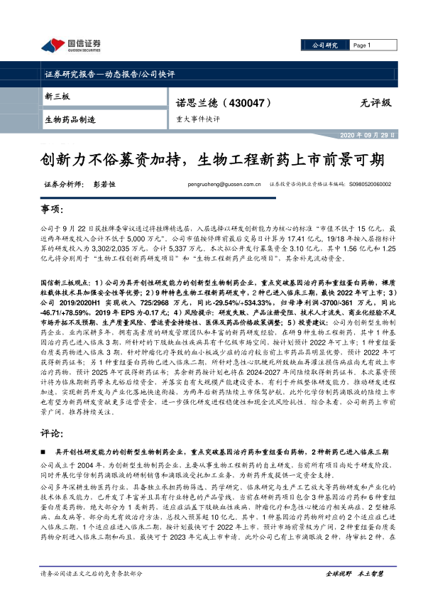 国信新三板观点:1)公司为具开创性研发能力的创新型生物制药企业,重点突破基因治疗药和重组蛋白药物,裸质粒载体技术具加强安全性等优势;2)9种特色生物工程新药研发中,2种已进入临床三期,最快2022年可上市;3)公司2019/2020H1实现收入725/2968万元,同比-29.54%/+534.33%,归母净利润-3700/-361万元,同比-46.71/+78.59%,2019年EPS为-0.17元;4)风险提示:研发失败、产品注册受阻、技术人才流失、商业化经验不足市场开拓不及预期、生产质量风险、营运资金持续性、医保及药品价格政策调整;5)投资建议:公司为创新型生物制药企业,业内深耕多年,拥有高素质的研发管理团队和丰富的新药研发经验,在研9种生物工程新药,其中1种基因治疗药已进入临床3期,所针对的下肢缺血性疾病具有千亿级市场空间,按计划预计2022年可上市;1种重组蛋白质类药物进入临床3期,针对肿瘤化疗导致的血小板减少症的治疗较当前上市药品具明显优势,预计2022年可获得新药证书;另1种重组蛋白药物已进入临床二期,所针对急性心肌梗死所致缺血再灌注损伤病症尚无有效上市治疗药物,预计2025年可获得新药证书;其余新药按计划也将在2024-2027年间陆续取得新药证书。本次募资预计将为临床期新药带来充裕后续资金,并落实自有大规模产能建设资本,有利于升级整体研发能力,推动研发进程加速,实现新药开发与产业化落地快速衔接,为两年后新药陆续上市保驾护航,此外化学仿制药滴眼液的陆续上市也有望为新药研发贡献更多运营资金,进一步强化研发进程稳健性和现金流风险抗性。综合来看,公司新药上市前景广阔,推荐持续关注。