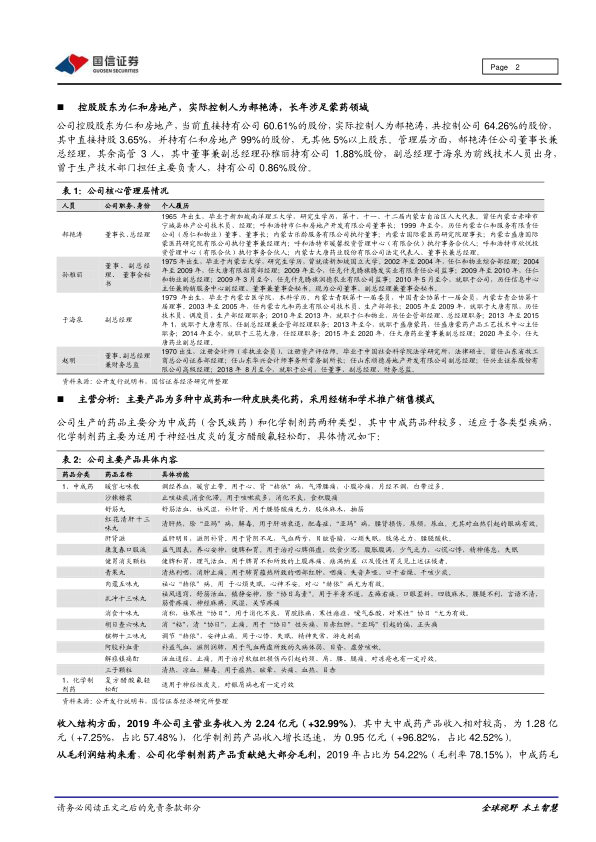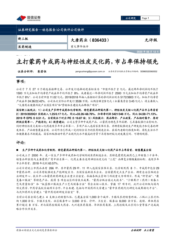 国信新三板观点:1)公司生产多种中成药和化学制剂,特色蒙药品种国内第一,神经性皮炎核心化药产品市占率居首2)2019/2020Q1实现收入1.25/0.17亿元,同比+33.26/-68.76%,归母净利润5421/348万元,同比34.59/-71.13%,2019年EPS为0.51元,当前股本下对应PE为19.87倍;3)风险提示:药品降价、产业政策、产品相对集中、原材料供应商单一、产能消化;4)投资建议:公司主营多种中成药产品,以蒙药为特色多年深耕,已具备较强行业影响力,同时神经性皮炎类核心化药连续多年市占率第一,多项产品入选国家医保目录,并拥有较强的生产研发能力和完善的研发体系,产品销售覆盖全国。公司作为已形成一定的综合实力的医药制造企业,在国内老龄化程度加剧、居民生活水平和健康要求不断提高、国家积极推动中药产业现代化水平提高的背景下具有相对较大的发展空间,可持续观察。