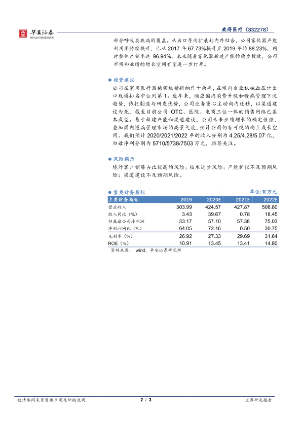 公司在家用医疗器械领域精耕细作十余年,在境内企业机械血压计出口规模排名中位列第1。近年来,顺应国内消费升级和慢病管理下沉趋势,依托制造与研发优势,公司业务重心主动向内迁移,以渠道建设为先,截至目前公司OTC、医院、电商三位一体的销售网络已基本成型。基于新建产能和渠道建设,公司未来业绩增长的确定性强,叠加国内慢病管理市场的高景气度,预计公司仍有可观的向上成长空间。我们预计2020/2021/2022年的收入分别为4.25/4.28/5.07亿,归母净利分别为5710/5738/7503万元,推荐关注。