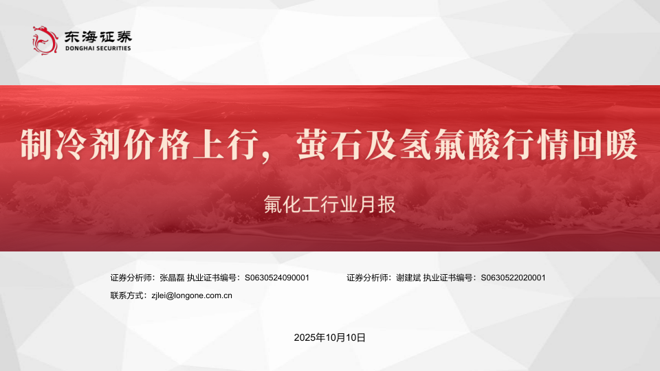 投资建议:2025年二代制冷剂配额再度削减,三代制冷剂生产配额总量保持在基线值,下游需求旺盛,二代、三代制冷剂供需关系仍然趋紧。2025年以来制冷剂价格稳步上行,根据百川盈孚数据,截至2025年9月30日,三代制冷剂R32、R134a、R125价格分别为62500元/吨、52000元/吨、45500元/吨,较上年度同期分别上涨64.47%、55.22%、40.00%;原料端萤石、无水氢氟酸价格回暖,截至9月30日,萤石湿粉和无水氢氟酸价格分别环比上涨10.07%和11.83%,氟化工行业有望维持高景气。建议关注制冷剂行业龙头和拥有较完善产业链的氟化工生产企业,如巨化股份、三美股份,以及氟化工原料相关的金石资源等企业。