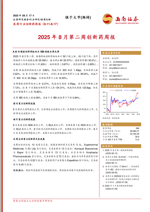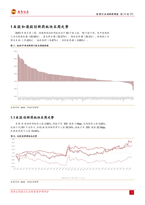 2025年8月第二周,陆港两地创新药板块共计92个股上涨,16个股下跌。其中涨幅前三为北海康成-B(35.56%)、基石药业-B(32.57%)、德琪医药-B(30.2%)。跌幅前三为博安生物(-11.63%)、南新制药(-5.87%)、来凯医药-B(-3.85%)。