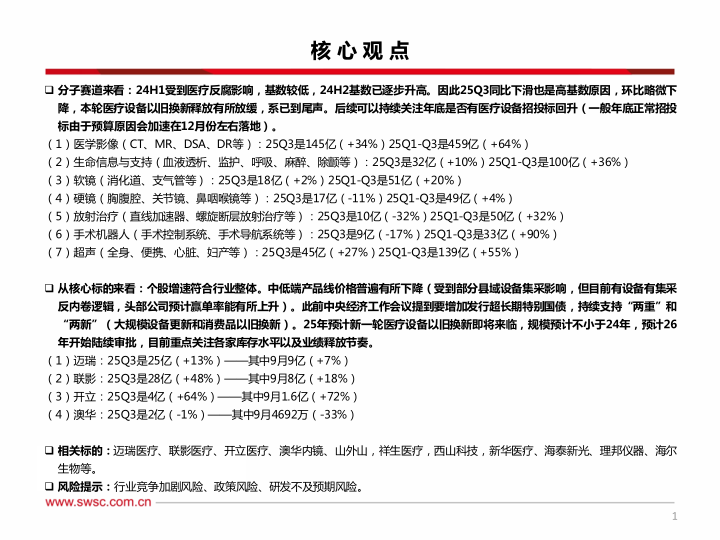 分子赛道来看:24H1受到医疗反腐影响,基数较低,24H2基数已逐步升高。因此25Q3同比下滑也是高基数原因,环比略微下降,本轮医疗设备以旧换新释放有所放缓,系已到尾声。后续可以持续关注年底是否有医疗设备招投标回升(一般年底正常招投标由于预算原因会加速在12月份左右落地)。