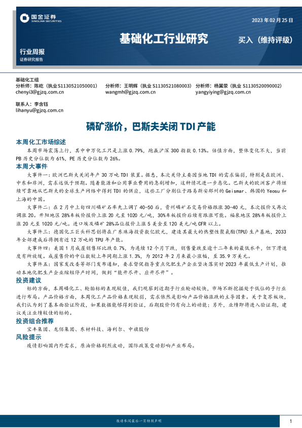 基础化工行业研究:磷矿涨价,巴斯夫关闭TDI产能