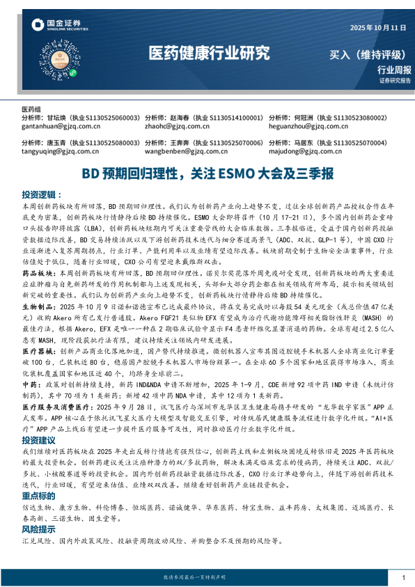 医药健康行业研究:BD预期回归理性,关注ESMO大会及三季报