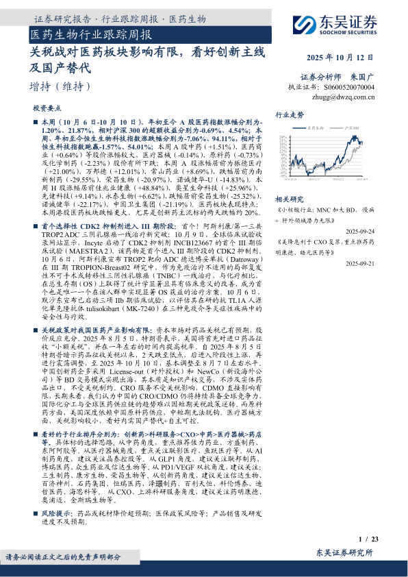 医药生物行业跟踪周报:关税战对医药板块影响有限,看好创新主线及国产替代
