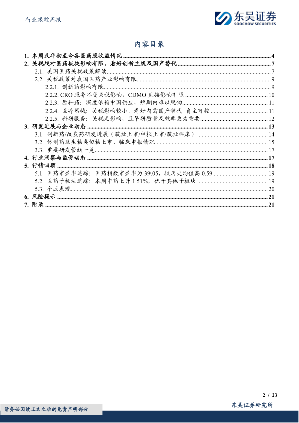关税政策对我国医药产业影响有限:资本市场对药品关税已有预期,股价反应充分。2025年8月5日,特朗普表示,美国将首先对进口药品征收“小额关税”,并在一年左右的时间内提高税率。自2025年8月5日特朗普暗示药品征收关税以来,2天跌至低点,后进入阶段性上涨,再进行震荡调整,至2025年10月10日,基本调整至8月7日左右水平。中国创新药企多采用License-out(对外授权)和NewCo(新设海外公司)等BD交易模式实现出海,其本质是知识产权交易,不涉及实体药品出口,不受关税制约。CRO服务不受关税影响,CDMO直接影响有限,长期来看,我们认为中国的CRO/CDMO仍将持续具备全球竞争力,国际化分工与全球医药供应链的趋势难以因短期关税政策逆转。而原料药方面,美国深度依赖中国原料药供应,中短期无法脱钩。医疗器械方面,关税影响较小,看好内需国产替代+自主可控。