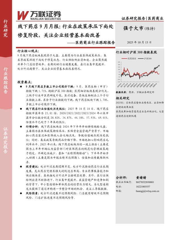 行情分析:线下药店板块自2024年下半年开始持续跑输大盘,主要因为在医保政策持续承压,医保资金监管趋严背景下,市场担心药店客流和医保收入会大幅流失,导致估值被压到历史低位;同时,集采政策导致药品价格下降,市场也担心影响药店毛利率水平。2025年以来,线下药店板块历经一波上涨后(主要是因为上半年市场认为监管部门对医保药店的规范化管理政策趋于稳定,不确定性减少,叠加“业绩预期驱动”),下半年开始步入回调(主要是因为中报业绩不达预期),估值和业绩戴维斯双杀。