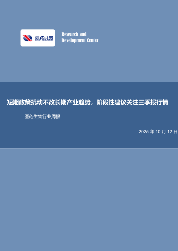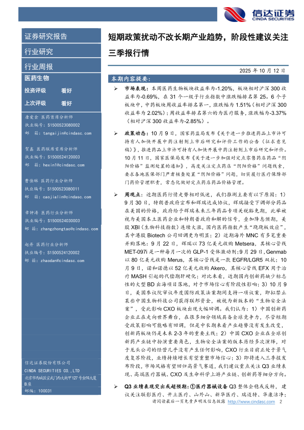 周观点:近期医药行情走势相对低迷,我们推测主要有以下原因:1)9月30日,特朗普政府宣布和辉瑞达成协议,辉瑞接受下调部分药品在美国的价格,政府给予辉瑞未来三年药品专项关税豁免期,此举被视为美国本土医药企业和特朗普政府和解的信号,叠加降息预期,美股XBI(生物科技指数)连续大涨,国内医药指数产生“跷跷板效应”,其中港股Biotech公司回调更为明显;2)近期海外MNC有多笔重要并购落地:9月22日,辉瑞以73亿美元收购Metsera,其核心管线MET-097i是一种每月一次的GLP-1受体激动剂;9月29日,Genmab以80亿美元收购Merus,其核心管线是一款EGFR/LGR5双抗;10月9日,诺和诺德以52亿美元收购Akero,其核心管线EFX用于治疗MASH引起的代偿期肝硬化;对比来看,近期国内创新药缺少标志性的大型BD出海项目落地,对于市场信心有阶段性影响;3)10月9日,美国参议院审议年度国防政策法案期间支持一项议案,即拟禁止某些中国生物科技公司获得联邦资金,被视为新版本的“生物安全法案”,受此影响CXO板块出现大幅回调。我们认为:1)中国创新药企业正在走向世界舞台,在很多细分领域具备全球竞争力,尽管短期受政策影响可能略有回调,但是中长期来看产业趋势没有发生改变,创新药板块仍是未来2-3年的重要主线;2)中国CXO企业在全球创新药产业链中扮演重要角色,生物安全法案的版本历经多次演绎,对于龙头公司的经营几乎没有产生任何影响,CXO行业目前正处于景气度复苏阶段,业绩持续增长有望重塑市场信心;3)即将进入三季报发布阶段,市场风格有望回归高景气赛道,我们建议重点关注Q3业绩表现、高端医疗器械、CXO及生命科学上游产业链、创新药等细分方向。