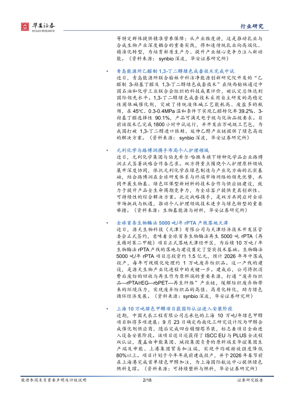 近日,源天生物科技(天津)有限公司与天津经济技术开发区管委会正式签约,意味着全球首条生物酶法再生5000吨rPTA(再生精对苯二甲酸)项目正式落地天津经开区,为后续10万吨/年生物酶法rPTA产线的落地与建设奠定了坚实技术基础。生物酶法5000吨/年rPTA项目总投资约1.5亿元,预计2026年年中落成投产,每年可规模化处理约1万吨废弃纺织品。这一产线的建设,是源天生物产业化进程中的关键一步。建成后,公司将把消费后废纺的回收与再生作为原料端的重要来源,打通“废弃纺织品—rPTA/rEG—rbPET—再生纤维”产业链,缓解纺织废弃物带来的环境压力,实现废弃纺织品的高值、高质化转化,助力绿色循环经济发展。(资料来源:synbio深波,华安证券研究所)