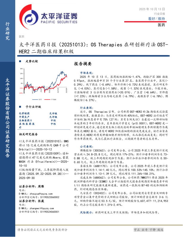 2025年10月13日,医药板块涨跌幅-1.47%,跑输沪深300指数0.97pct,涨跌幅居申万31个子行业第27名。各医药子行业中,医院(-0.29%)、线下药店(-0.69%)、体外诊断(-0.72%)表现居前,医疗研发外包(-4.03%)、医疗设备(-1.58%)、疫苗(-1.32%)表现居后。个股方面,日涨幅榜前3位分别为宏源药业(+20.01%)、广生堂(+8.64%)、万邦德(+7.22%);跌幅榜前3位为皓元医药(-6.79%)、南微医学(-6.78%)、博腾股份(-6.27%)。