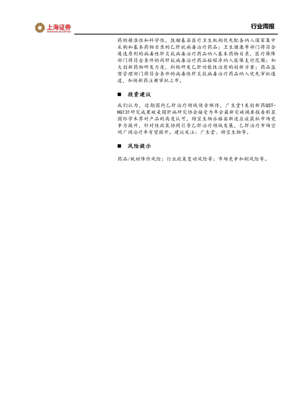 我们认为,近期国内乙肝治疗领域佳音频传,广生堂1类创新药GST-HG131研究成果被美国肝病研究协会接受为年会最新突破摘要报告彰显国际学术界对产品的高度认可,特宝生物派格宾新适应症获批市场竞争力提升,针对性政策协同引导乙肝治疗领域发展,乙肝治疗市场空间广阔治疗率有望提升。建议关注:广生堂、特宝生物等。