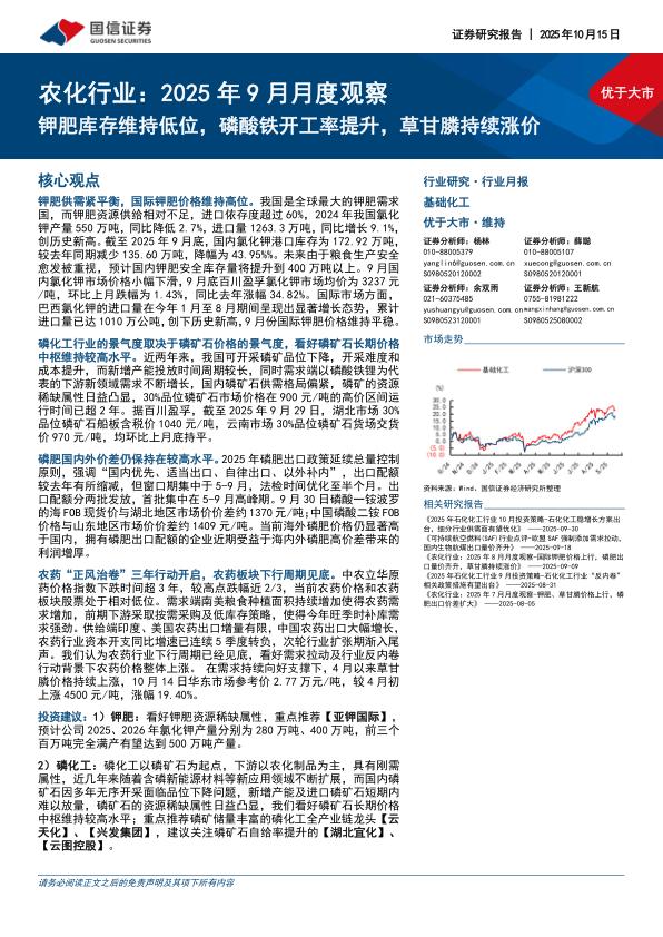 农化行业:2025年9月月度观察:钾肥库存维持低位,磷酸铁开工率提升,草甘膦持续涨价