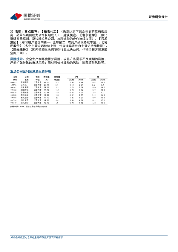 风险提示:安全生产和环境保护风险;农化产品需求不及预期的风险;产能扩张导致的市场风险;原材料价格波动的风险;国际贸易风险等。