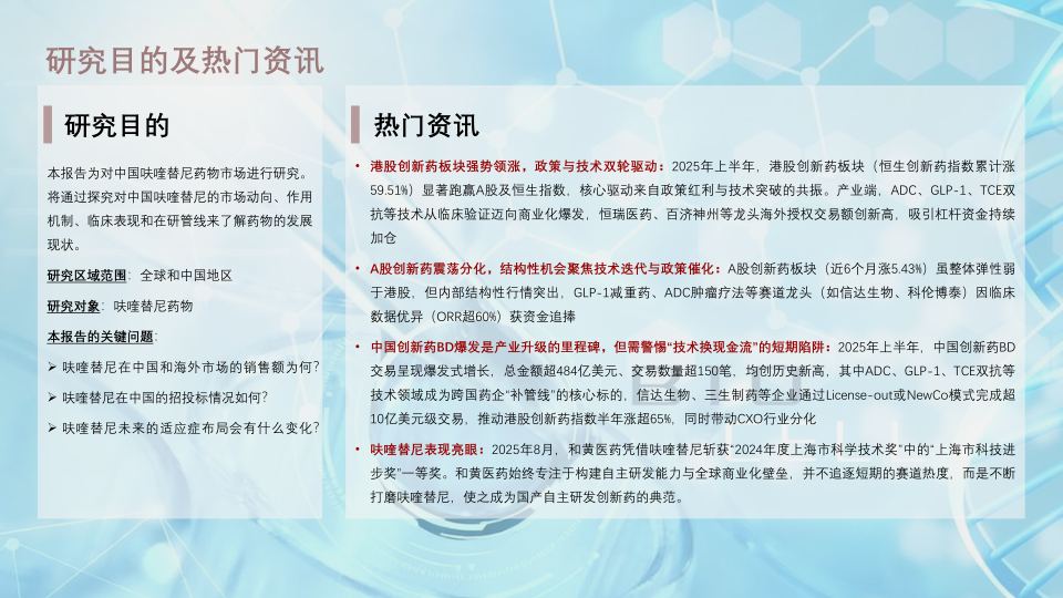 中国创新药BD爆发是产业升级的里程碑,但需警惕“技术换现金流”的短期陷阱:2025年上半年,中国创新药BD交易呈现爆发式增长,总金额超484亿美元、交易数量超150笔,均创历史新高,其中ADC、GLP-1、TCE双抗等技术领域成为跨国药企“补管线”的核心标的,信达生物、三生制药等企业通过License-out或NewCo模式完成超10亿美元级交易,推动港股创新药指数半年涨超65%,同时带动CXO行业分化呋喹替尼表现亮眼:2025年8月,和黄医药凭借呋喹替尼斩获“2024年度上海市科学技术奖”中的“上海市科技进步奖”一等奖。和黄医药始终专注于构建自主研发能力与全球商业化壁垒,并不追逐短期的赛道热度,而是不断打磨呋喹替尼,使之成为国产自主研发创新药的典范。