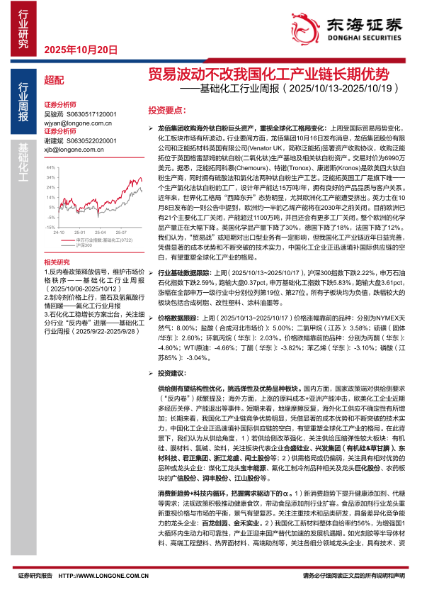 龙佰集团收购海外钛白粉巨头资产,重视全球化工格局变化:上周受国际贸易局势变化,化工板块市场有所波动。行业要闻方面,龙佰集团10月16日发布消息,龙佰集团股份有限公司和泛能拓材料英国有限公司(Venator UK,简称泛能拓)签署资产收购协议,收购泛能拓位于英国格雷瑟姆的钛白粉(二氧化钛)生产基地及相关钛白粉资产。交易对价为6990万美元。据悉,泛能拓同科慕(Chemours)、特诺(Tronox)、康诺斯(Kronos)是欧美四大钛白粉生产商,同时拥有硫酸法和氯化法两种钛白粉生产工艺。泛能拓英国工厂是旗下唯一一个生产氯化法钛白粉的工厂,设计年产能达15万吨/年,拥有良好的产品品质与客户关系。近年来,世界化工格局“西降东升”态势明显,尤其欧洲化工产能遭受挤出。英力士在10月8日发布的一则公告中提到,欧洲约一半的乙烯产能将在2030年之前关闭。目前欧洲已有21个主要化工厂关闭,产能超过1100万吨,并且还会有更多工厂关闭。整个欧洲的化学品产量正在大幅下降。英国化学品产量下降了30%,德国下降了18%,法国下降了12%。我们认为,“贸易战”或短期对出口型业务有一定影响,但我国化工产业链近年日益完善,凭借显著的成本优势和不断突破的技术实力,中国化工企业正迅速填补国际供应链的空白,有望重塑全球化工产业的格局。