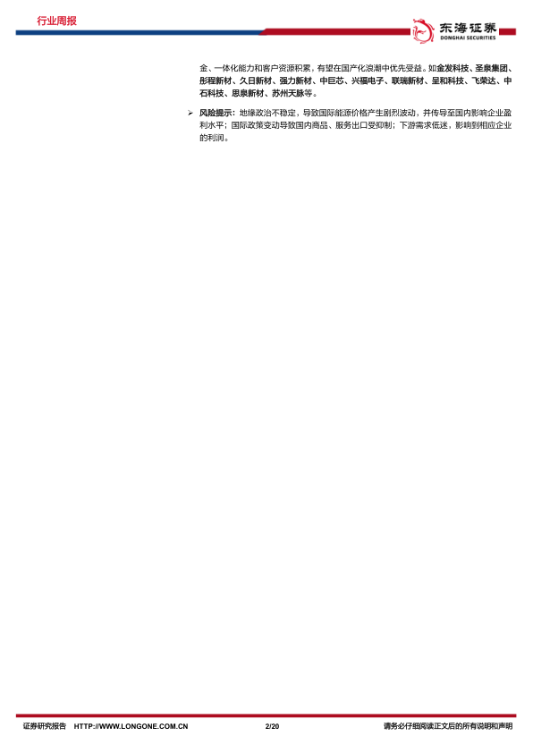 风险提示:地缘政治不稳定,导致国际能源价格产生剧烈波动,并传导至国内影响企业盈利水平;国际政策变动导致国内商品、服务出口受抑制;下游需求低迷,影响到相应企业的利润。