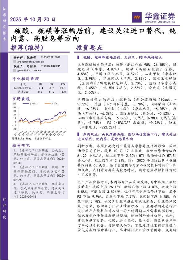 基础化工行业研究:硫酸、硫磺等涨幅居前,建议关注进口替代、纯内需、高股息等方向