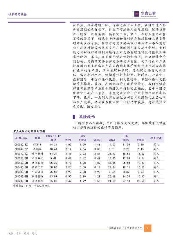 下游需求不及预期;原料价格或大幅波动;环保政策大幅变动;推荐关注标的业绩不及预期。