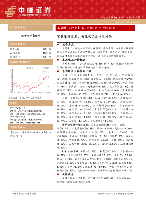 下跌:上纬新材(-32.74%)、联合化学(-32.57%)、思泉新材(-21.90%)、金固股份(-19.53%)、振华股份(-19.06%)、圣泉集团(-18.04%)、宝丽迪(-17.64%)、三孚新科(-16.80%)、斯菱股份(-16.39%)、联瑞新材(-15.52%)、长华化学(-15.41%)、久日新材(-15.20%)、奇德新材(-15.19%)、德邦科技(-15.17%)、天铁科技(-14.20%)、湖北宜化(-14.09%)、国瓷材料(-13.80%)、建龙微纳(-13.74%)、诺普信(-13.67%)、震安科技(-13.34%)。