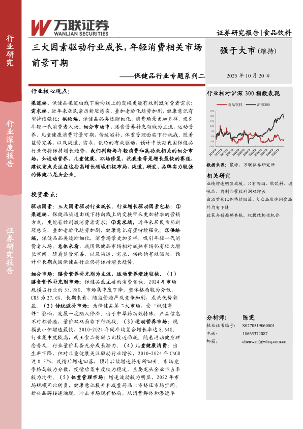渠道端,保健品渠道由线下转向线上的变换更能有效刺激消费者需求;需求端,近年来居民亲历新冠感染,叠加老龄化趋势加剧,健康意识有望持续强化;供给端,保健品品类逐渐细化,消费场景更加多样,吸引年轻一代消费者入场。细分市场中,膳食营养补充领域为主流,运动营养、儿童健康消费前景可期,传统滋补、体重管理面临下行挑战。随着监管完善,以及渠道、需求、供给的有效驱动,预计中长期我国保健品行业仍将保持增长趋势,我们判断与年轻消费和高功效相关的细分市场,如运动营养、儿童健康、职场修复、抗衰老等是增长最快的赛道,建议重点关注在这些高增长领域积极布局、渠道、研发、品牌实力较强的保健品龙头企业。