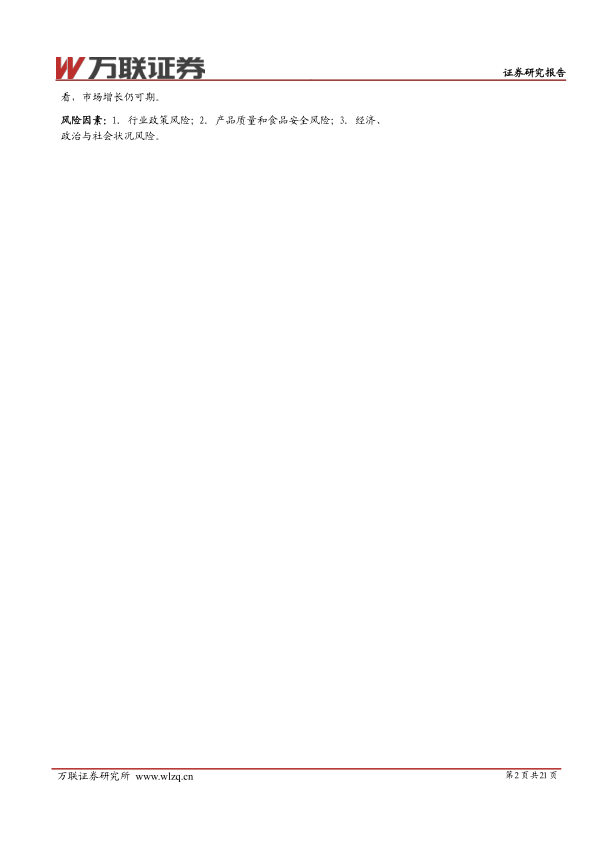 风险因素:1.行业政策风险;2.产品质量和食品安全风险;3.政治与社会状况风险。