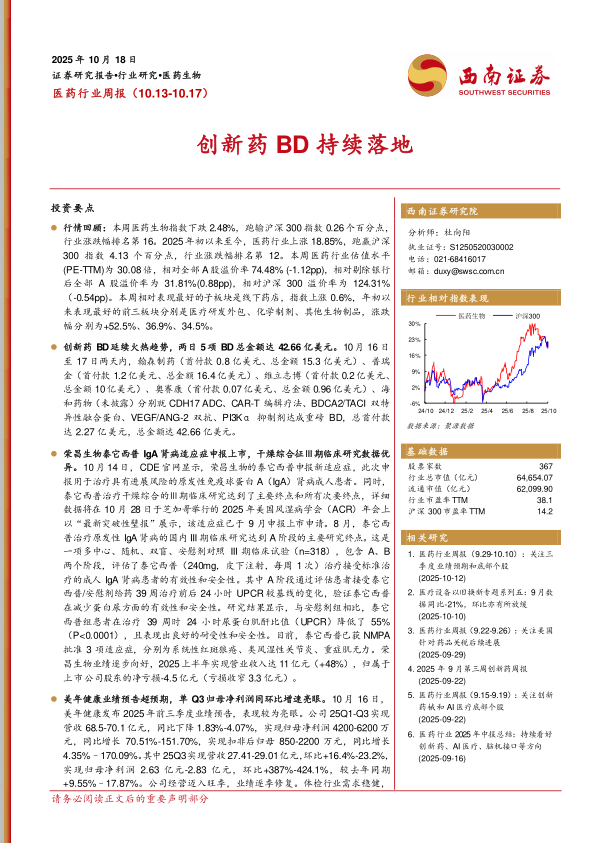 医药行业周报:创新药BD持续落地
