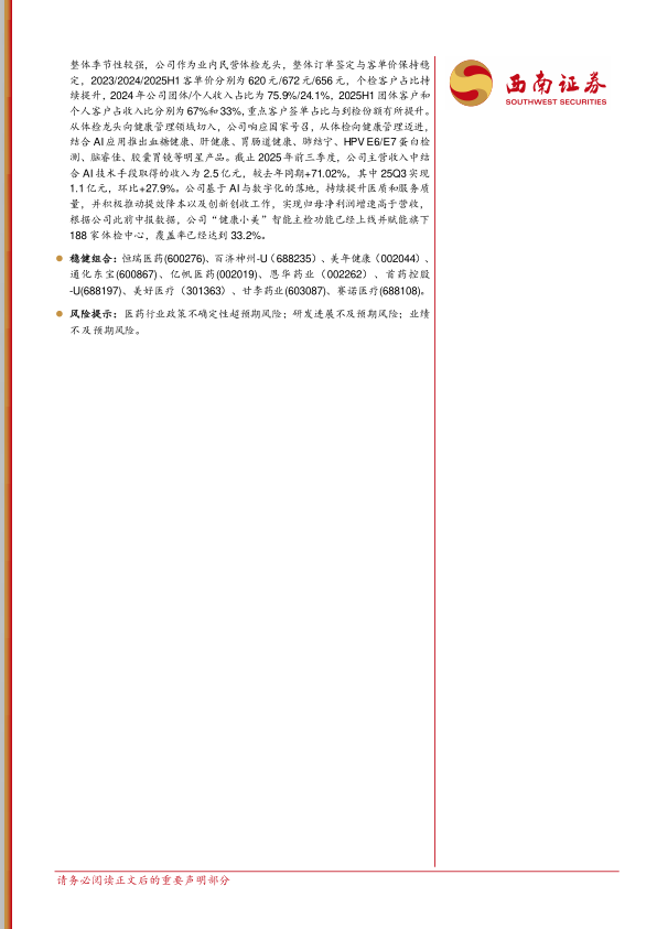 美年健康业绩预告超预期,单Q3归母净利润同环比增速亮眼。10月16日,美年健康发布2025年前三季度业绩预告,表现较为亮眼。公司25Q1-Q3实现营收68.5-70.1亿元,同比下降1.83%-4.07%,实现归母净利润4200-6200万元,同比增长70.51%-151.70%,实现扣非后归母850-2200万元,同比增长4.35%–170.09%。其中25Q3实现营收27.41-29.01亿元,环比+16.4%-23.2%,实现归母净利润2.63亿元-2.83亿元,环比+387%-424.1%,较去年同期+9.55%–17.87%。公司经营迈入旺季,业绩逐季修复。体检行业需求稳健,整体季节性较强,公司作为业内民营体检龙头,整体订单签定与客单价保持稳定,2023/2024/2025H1客单价分别为620元/672元/656元,个检客户占比持续提升,2024年公司团体/个人收入占比为75.9%/24.1%,2025H1团体客户和个人客户占收入比分别为67%和33%,重点客户签单占比与到检份额有所提升从体检龙头向健康管理领域切入,公司响应国家号召,从体检向健康管理迈进,结合AI应用推出血糖健康、肝健康、胃肠道健康、肺结宁、HPV E6/E7蛋白检测、脑睿佳、胶囊胃镜等明星产品。截止2025年前三季度,公司主营收入中结合AI技术手段取得的收入为2.5亿元,较去年同期+71.02%,其中25Q3实现1.1亿元,环比+27.9%。公司基于AI与数字化的落地,持续提升医质和服务质量,并积极推动提效降本以及创新创收工作,实现归母净利润增速高于营收,根据公司此前中报数据,公司“健康小美”智能主检功能已经上线并赋能旗下188家体检中心,覆盖率已经达到33.2%。