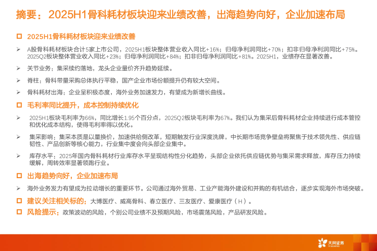 摘要:2025H1骨科耗材板块迎来业绩改善,出海趋势向好,企业加速布局