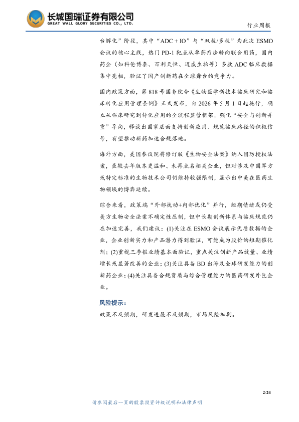 综合来看,政策端“外部扰动+内部优化”并行,短期情绪或仍受美方生物安全法案不确定性压制,但中长期创新体系与临床规范仍在加速完善,我们建议:(1)关注在ESMO会议展示优质数据的企业,企业创新实力和产品潜力得到验证,可能成为股价的短期催化剂;(2)重视三季报业绩基本面验证,重点关注创新产品放量、业绩增长或显著改善的企业;(3)关注具备BD出海及全球研发能力的创新药企业;(4)关注具备合规资质与综合管理能力的医药研发外包企业。