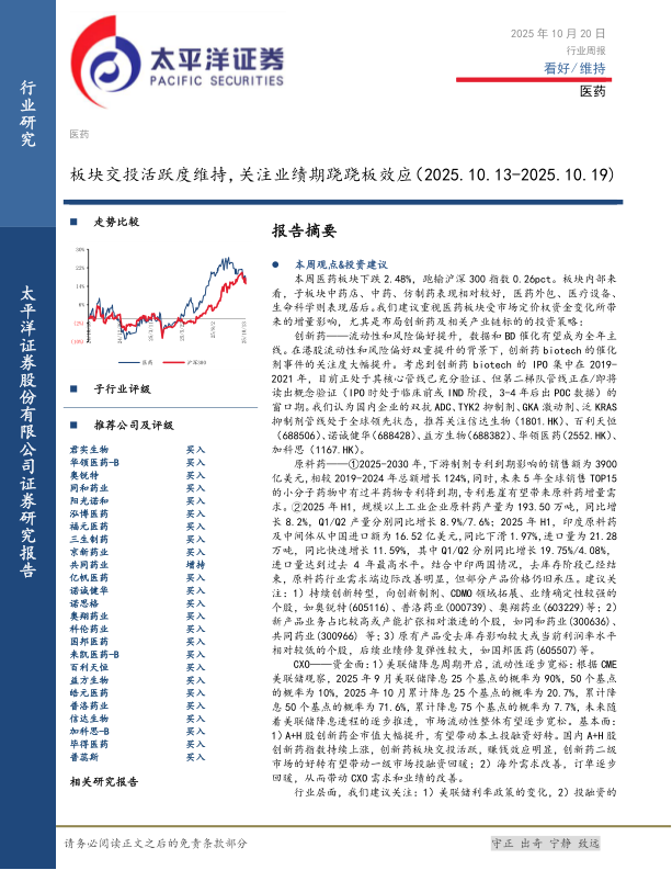 医药行业周报:板块交投活跃度维持,关注业绩期跷跷板效应
