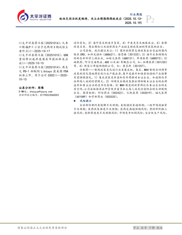 公司层面,我们建议关注:1)国内创新药支持政策出台受益的国内临床CRO,如阳光诺和(688621)、诺思格(301333);2)海外业务持续向好的生命科学上游企业,如皓元医药(688131)、毕得医药(688073);3)减肥药、阿尔茨海默症、ADC以及AI等概念公司,如:泓博医药(301230)等,4)新签订单超预期的公司,如:普蕊斯(301257)。