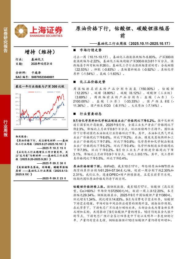 基础化工行业周报:原油价格下行,钴酸锂、碳酸锂涨幅居前