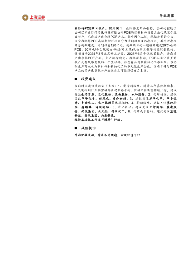 钴酸锂价格持续上涨。据钢联数据,截至10月17日,钴酸锂(高压实型,Co≥60%)市场价为372500元/吨,较前一周上涨12.20%,本月涨幅达29.34%。钢联数据显示,2025年9月中国钴酸锂产量11380吨,环比增长1.34%,同比增长14.83%。9月为消费电子需求旺季,钴酸锂下游需求稳健。市场对钴中间品供应趋紧的预期升温,提振钴价预期。在此背景下,下游电芯厂不仅进行刚性补库,头部企业也为筹备新长单而增加采购,共同推动了9月钴酸锂产量的增长。10月仍处在金九银十的节点,下游电芯厂预计会签订四季度中下旬以及明年一季度初的订单,产量仍有需求支撑,钢联数据预计10月钴酸锂产量仍将有所增加。鼎际得POE项目投产。10月16日,鼎际得发布公告称,公司的控股子公司辽宁鼎际得石化科技有限公司POE高端新材料项目工业化装置于近日投产,已成功产出合格POE产品。据中国化工报,根据此前的公告,辽宁鼎际得POE高端新材料项目分为近期项目及远期项目,其中近期项目分两期建设,计划投资120亿元。近期项目的一期项目建设20万吨/年POE、30万吨/年乙烷制α-烯烃(后工段)及公用工程等相关配套设施。该项目于2024年3月正式开工建设。2025年6月中试装置投产,并成功产出合格POE产品,生产运行稳定。鼎际得表示,POE工业化装置的投产是其战略发展的一个里程碑,标志着公司从精细化工添加剂、催化剂生产商成长为新材料和精细化工的多元化生产企业。该项目将为POE产品的国产化替代与产业链自主可控提供有力支撑。