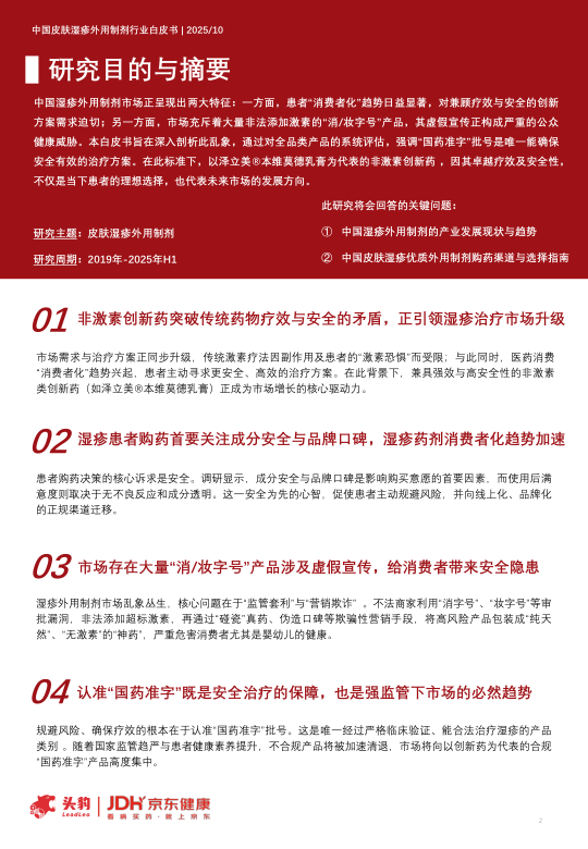 中国湿疹外用制剂市场正呈现出两大特征:一方面,患者“消费者化”趋势日益显著,对兼顾疗效与安全的创新方案需求追切;另一方面,市场充后着大量非法添加激素的“消/妆字号”产品,其虚假宣传正构成严重的公众健康威胁。本白皮书旨在深入部析此乱象,通过对全品类产品的系统评估,强调“国药准字”批号是唯一能确保安全有效的治疗方案。在此标准下,以泽立美®本维莫德乳膏为代表的非激素创新药,因其卓越疗效及安全性,不仅是当下患者的理想选择,也代表未来市场的发展方向。