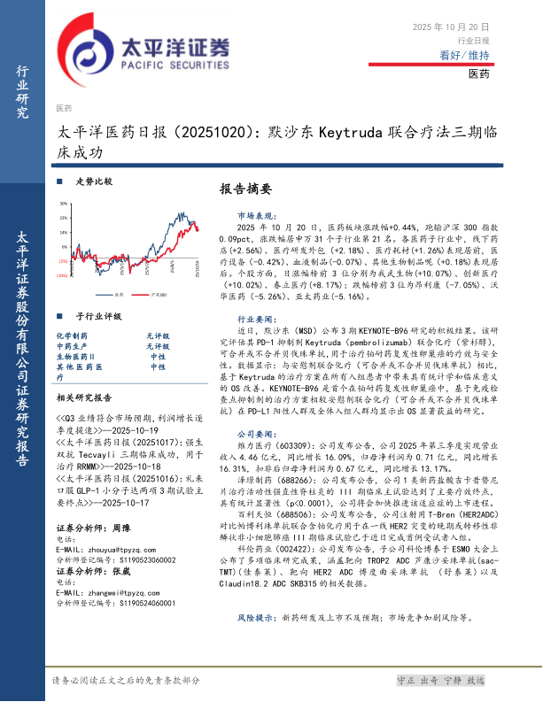 2025年10月20日,医药板块涨跌幅+0.44%,跑输沪深300指数0.09pct,涨跌幅居申万31个子行业第21名。各医药子行业中,线下药店(+2.56%)、医疗研发外包(+2.18%)、医疗耗材(+1.26%)表现居前,医疗设备(-0.42%)、血液制品(-0.07%)、其他生物制品呢(+0.18%)表现居后。个股方面,日涨幅榜前3位分别为我武生物(+10.07%)、创新医疗(+10.02%)、春立医疗(+8.17%);跌幅榜前3位为昂利康(-7.05%)、沃华医药(-5.26%)、亚太药业(-5.16%)。