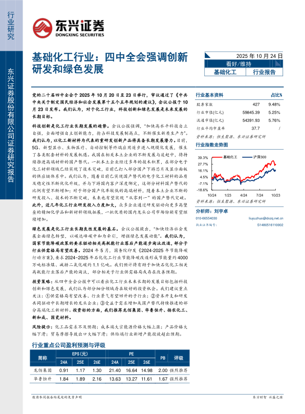 党的二十届四中全会于2025年10月20日至23日举行,审议通过了《中共中央关于制定国民经济和社会发展第十五个五年规划的建议》,会议公报于10月23日发布。我们认为,对于化工行业,科技创新和绿色发展是未来发展的长期目标。