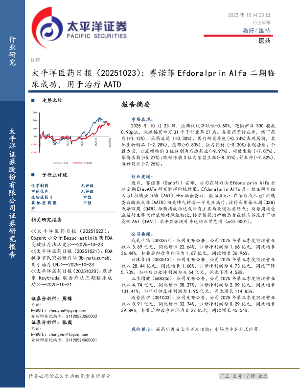 2025年10月23日,医药板块涨跌幅-0.60%,跑输沪深300指数0.90pct,涨跌幅居申万31个子行业第27名。各医药子行业中,线下药店(+1.12%)、医药流通(+0.30%)、医疗研发外包(+0.24%)表现居前,其他生物制品(-2.28%)、疫苗(-0.80%)、医疗耗材(-0.20%)表现居后。个股方面,日涨幅榜前3位分别为启迪药业(+9.97%)、硕世生物(+7.07%)、毕得医药(+5.27%);跌幅榜前3位为荣昌生物(-8.31%)、舒泰神(-7.52%)、海神药业(-7.25%)。