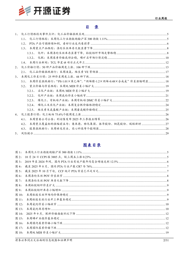 从PTA行业未来扩产情况来看,据百川盈孚数据,2025年国内PTA新增产能预计合计达到870万吨,其中东方盛虹、三房巷、新凤鸣分别新增250、320、300万吨。再往后看,2026年及以后规划产能仍有合计800万吨。但考虑到当前PTA盈利承压,其投产进程尚存在较大不确定性,2025年或已接近国内PTA行业扩产的尾声。据百川盈孚及各公司广告数据,截至2025年9月,国内PTA行业产能(权益口径)前七名分别为恒力石化、荣盛石化、桐昆股份、恒逸石化、新凤鸣、东方盛虹、三房巷,行业产能CR7达到76%。当前国内PTA行业集中度较高,龙头企业具备一定的定价权,同时也为行业自律与反内卷创造了良好的条件。2025年7月以后PTA行业陷入全行业严重亏损。2025年7月以来,PTA行业陷入全行业亏损,截至2025年10月下旬,CCF统计PTA价差已不足百元。当前PTA行业亏损严重,生产企业具备协同诉求。我们认为,当前PTA行业具备反内卷基础(未来新增产能有限、行业集中度高及当下生产企业亏损严重),后续行业有望实现良性发展,产品盈利或将得到显著修复。推荐标的:恒力石化、荣盛石化、新凤鸣、桐昆股份等。受益标的:恒逸石化、三房巷、东方盛虹等。
