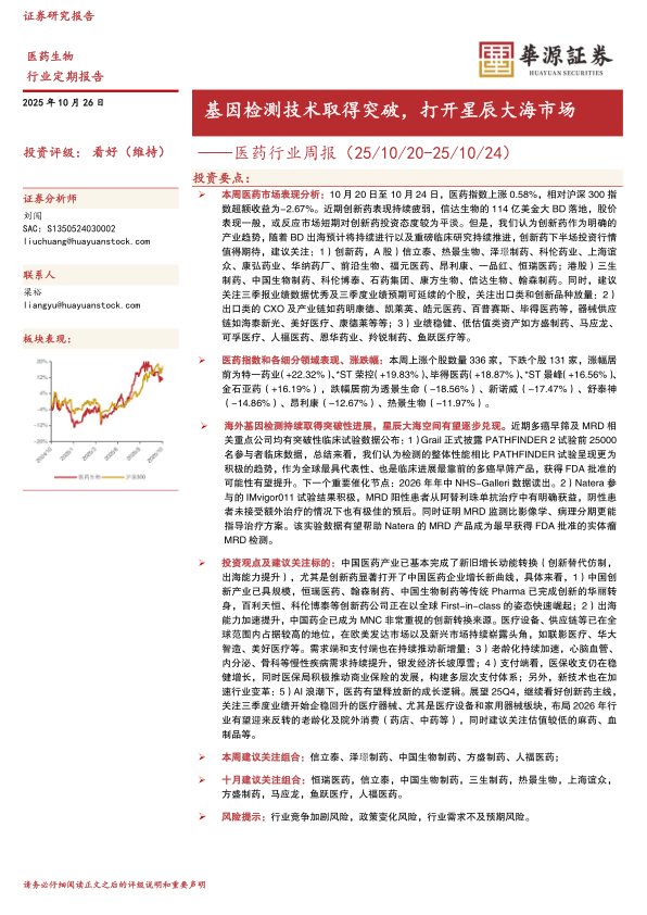 投资观点及建议关注标的:中国医药产业已基本完成了新旧增长动能转换(创新替代仿制,出海能力提升),尤其是创新药显著打开了中国医药企业增长新曲线,具体来看,1)中国创新产业已具规模,恒瑞医药、翰森制药、中国生物制药等传统Pharma已完成创新的华丽转身,百利天恒、科伦博泰等创新药公司正在以全球First-in-class的姿态快速崛起;2)出海能力加速提升,中国药企已成为MNC非常重视的创新转换来源。医疗设备、供应链等已在全球范围内占据较高的地位,在欧美发达市场以及新兴市场持续崭露头角,如联影医疗、华大智造、美好医疗等。需求端和支付端也在持续推动新增量:3)老龄化持续加速,心脑血管、内分泌、骨科等慢性疾病需求持续提升,银发经济长坡厚雪;4)支付端看,医保收支仍在稳健增长,同时医保局积极推动商业保险的发展,构建多层次支付体系;另外,新技术也在加速行业变革:5)AI浪潮下,医药有望释放新的成长逻辑。展望25Q4,继续看好创新药主线,关注三季度业绩开始企稳回升的医疗器械、尤其是医疗设备和家用器械板块,布局2026年行业有望迎来反转的老龄化及院外消费(药店、中药等),同时建议关注估值较低的麻药、血制品等。
