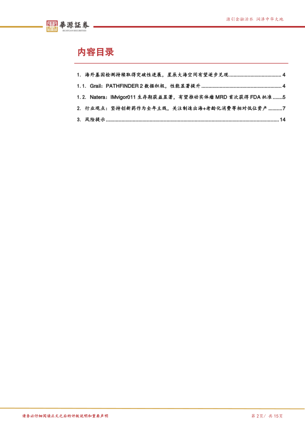 海外基因检测持续取得突破性进展,星辰大海空间有望逐步兑现。近期多癌早筛及MRD相关重点公司均有突破性临床试验数据公布:1)Grail正式披露PATHFINDER2试验前25000名参与者临床数据,总结来看,我们认为检测的整体性能相比PATHFINDER试验呈现更为积极的趋势,作为全球最具代表性、也是临床进展最靠前的多癌早筛产品,获得FDA批准的可能性有望提升。下一个重要催化节点:2026年年中NHS-Galleri数据读出。2)Natera参与的IMvigor011试验结果积极,MRD阳性患者从阿替利珠单抗治疗中有明确获益,阴性患者未接受额外治疗的情况下也有极佳的预后。同时证明MRD监测比影像学、病理分期更能指导治疗方案。该实验数据有望帮助Natera的MRD产品成为最早获得FDA批准的实体瘤MRD检测。