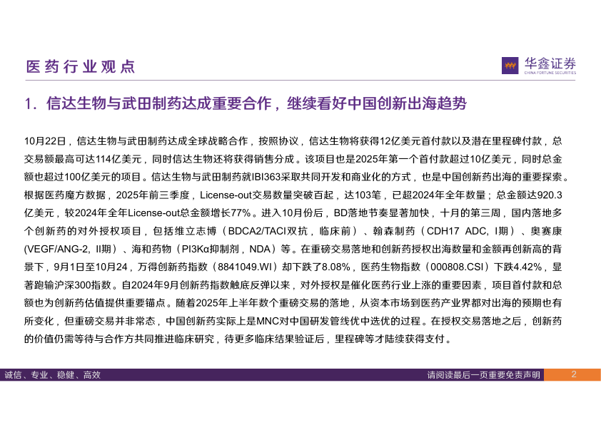 10月22日,信达生物与武田制药达成全球战略合作,按照协议,信达生物将获得12亿美元首付款以及潜在里程碑付款,总交易额最高可达114亿美元,同时信达生物还将获得销售分成。该项目也是2025年第一个首付款超过10亿美元,同时总金额也超过100亿美元的项目。信达生物与武田制药就IBI363采取共同开发和商业化的方式,也是中国创新药出海的重要探索。根据医药魔方数据,2025年前三季度,License-out交易数量突破百起,达103笔,已超2024年全年数量;总金额达920.3亿美元,较2024年全年License-out总金额增长77%。进入10月份后,BD落地节奏显著加快,十月的第三周,国内落地多个创新药的对外授权项目,包括维立志博(BDCA2/TACI双抗,临床前)、翰森制药(CDH17ADC,I期)、奥赛康(VEGF/ANG-2,II期)、海和药物(PI3Kα抑制剂,NDA)等。在重磅交易落地和创新药授权出海数量和金额再创新高的背景下,9月1日至10月24,万得创新药指数(8841049.WI)却下跌了8.08%,医药生物指数(000808.CSI)下跌4.42%,显著跑输沪深300指数。自2024年9月创新药指数触底反弹以来,对外授权是催化医药行业上涨的重要因素,项目首付款和总额也为创新药估值提供重要锚点。随着2025年上半年数个重磅交易的落地,从资本市场到医药产业界都对出海的预期也有所变化,但重磅交易并非常态,中国创新药实际上是MNC对中国研发管线优中选优的过程。在授权交易落地之后,创新药的价值仍需等待与合作方共同推进临床研究,待更多临床结果验证后,里程碑等才陆续获得支付。
