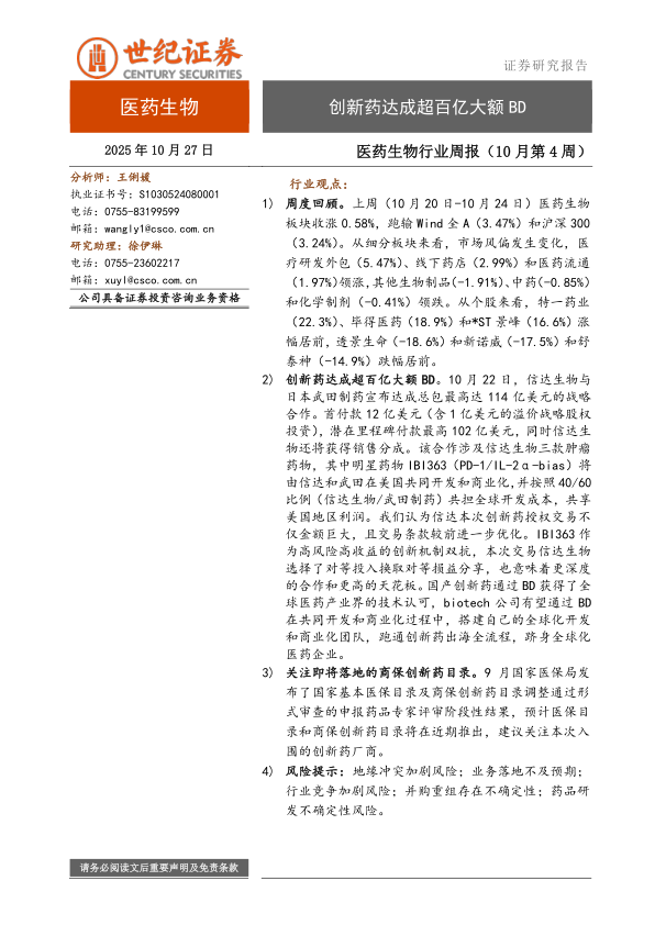 医药生物行业周报(10月第4周):创新药达成超百亿大额BD