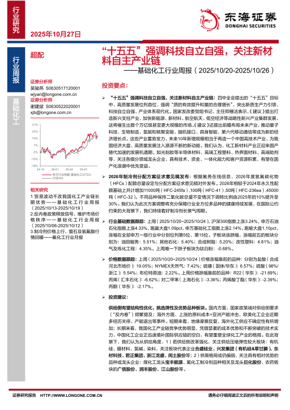 基础化工行业周报:“十五五”强调科技自立自强,关注新材料自主产业链